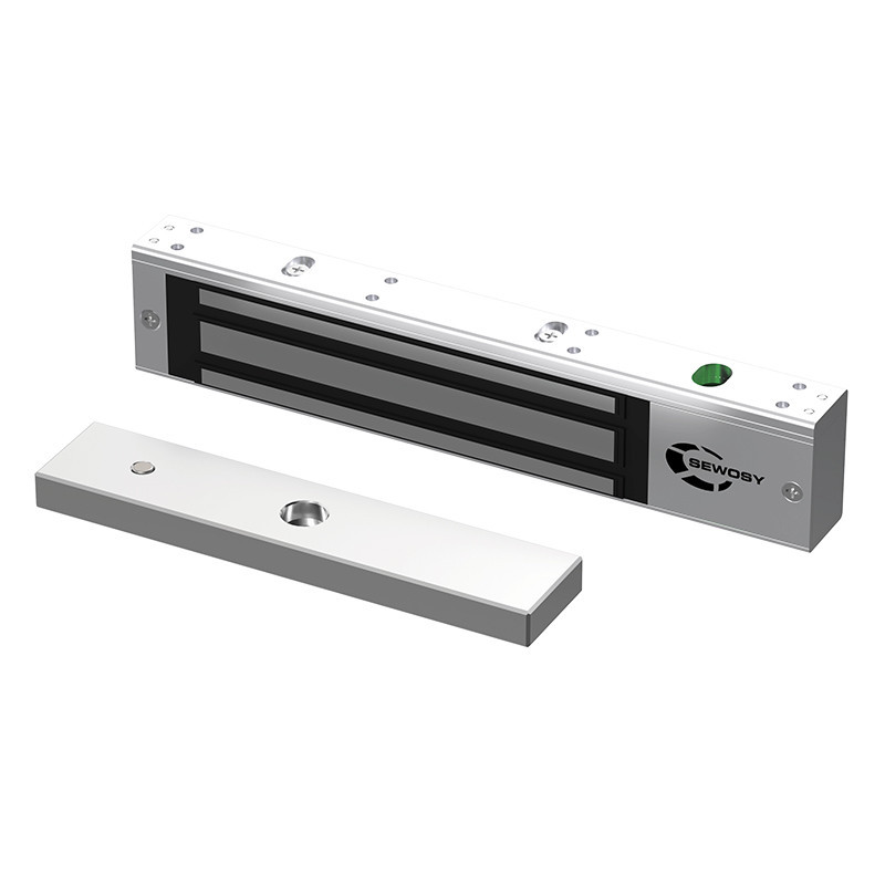 Ventouse électromagnétique en applique, finition grise, force de tenue 300 daN. Contact d’état C/NO/NC (indique porte verrouillée / déverrouillée). Indice de protection IP42. Certification NF S 61-937 (valable uniquement en 24 V DC). Alimentation compatible 12/24 V.